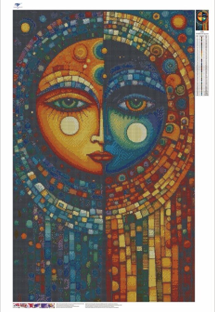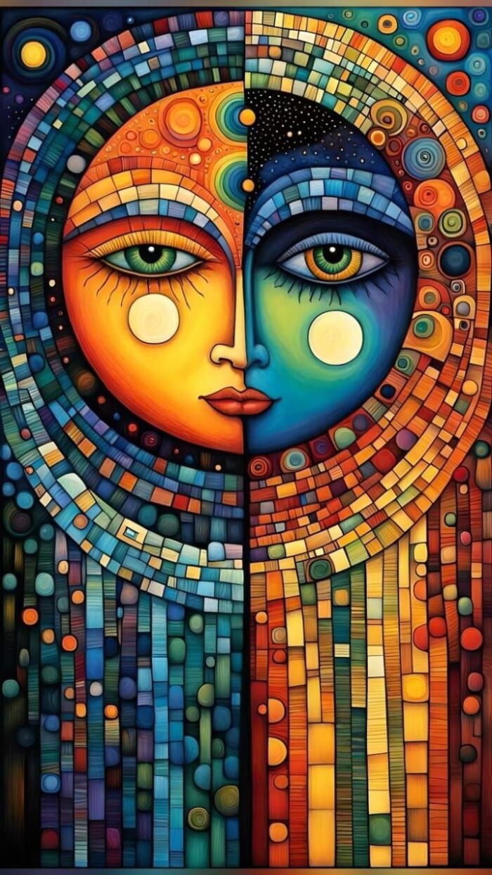 در این چهره، جایی که شب با روز روبرو میشود، راز هزارتوی دوتایی است. سمت راست در آفتاب درخشان به حمام در میآید و رنگهای نارنجی و زرد میدرخشد. سمت چپ در هالهای از سرمهای و آبی است، با نشانههایی از ستارگان مانند خاطراتی که در تاریکی پخش میشوند.