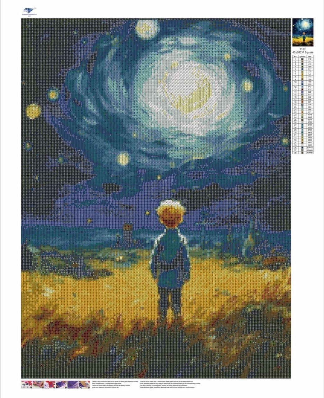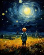 در دل دشتی طلایی، پسرکی با موهای طلایی و چشمانی پر از سوال، تنها ایستاده بود. نامش “اِل‌وین” بود؛ کودکی که همیشه شب‌ها را بیشتر از روز دوست داشت. او به سوی آسمان چرخان خیره شده بود؛ آسمانی که همانند دریایی از رنگ‌ها، درونش می‌چرخید و ستارگانش می‌درخشیدند.