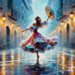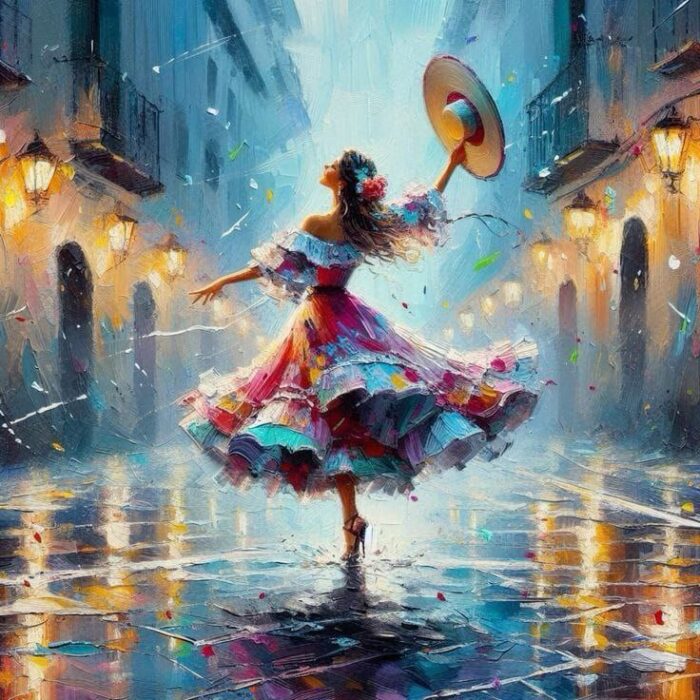 در کوچهای بارانی که چراغهای زرد و گرمش مثل فانوسهای جادویی در مه میدرخشیدند، دختری با پیراهنی رنگارنگ و پر از زندگی رقصید. دستش را به آسمان برد و کلاهی را که مثل نمادی از آزادی بود، در دست داشت. هر چرخش او، مثل قطرههای باران روی سنگفرش خیابان، داستانی از شادی و امید را روایت میکرد. در آن لحظه، جهان نه از سرما و تاریکی، بلکه از نور و رنگ و موسیقی پر شده بود. او نه تنها رقصید، بلکه در برابر زندگی ایستاد، با هر قدم و هر حرکتش به ما یادآوری کرد که حتی در سختترین روزها، میتوان شادی را یافت و با آن رقصید.