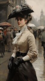 در خیابانهای مهآلود شهر، بانویی ایستاده بود؛ با کلاهی بزرگ که گلهای ظریف و توریهای سفید را در بر گرفته بود. چهرهاش آرام و عمیق، گویی رازهای بسیاری را در دل داشت. دستکشهای مشکیاش، نمادی از ظرافت و محافظت از دستهای ناپیدایش بود.