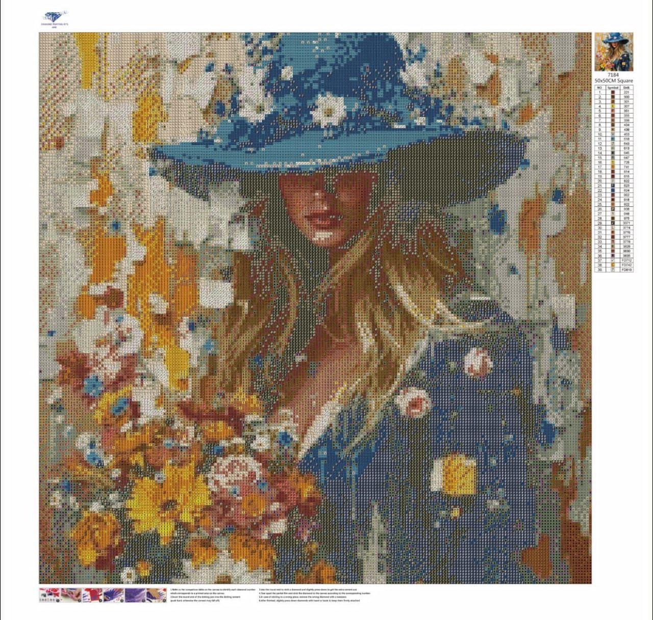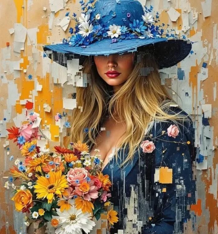 در شهری که رنگها و شکلها با هم ترکیب شده بودند، زنی زندگی میکرد که همیشه کلاه بزرگی به سر داشت. این کلاه نه تنها آبی بود، بلکه پر از گلهای زیبا و رنگارنگ بود که روی آن شکفته بودند؛ گلهایی که انگار از دل طبیعت به دنیای دیجیتال آمده بودند.