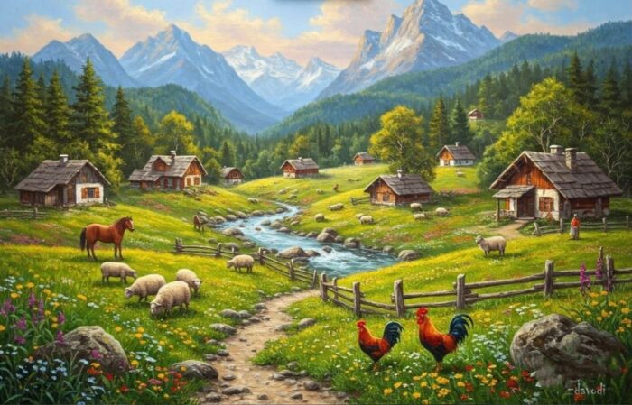 پیرمردی مهربان کنار در خانهاش ایستاده بود و به گوسفند وفادارش نگاه میکرد. هر روز صبح، با لبخند به حیوانات صبح بهخیر میگفت. خروسها با صدای بلندشان طلوع خورشید را اعلام میکردند، و اسب قهوهای با آرامش در میان گلهای وحشی میچرید.