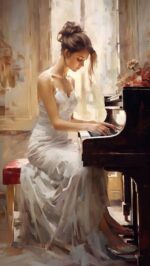 او در اتاقی که نور ملایم صبح از پنجره‌ها به آرامی می‌تابید، با دقت و تمرکز پشت پیانو نشست. هر نت موسیقی که از انگشتانش جاری می‌شد، داستانی از دل، روح و خاطرات را روایت می‌کرد. لباس سفید و ساده‌اش مانند یک پرده‌ی آرامش‌بخش بود که در برابر پیانوی سیاه می‌درخشید. انگار هر ضربه‌ای که به کلیدها می‌زد، نه فقط صدا، بلکه تکه‌هایی از وجودش را به جهان هدیه می‌کرد. گلی که کنار پیانو بود، یادآور لطافت و زندگی‌ای بود که در میان تاریکی و روشنایی این لحظه‌ها رشد می‌کرد. این لحظه، جایی بود که او با موسیقی، به سکوت معنی می‌بخشید.