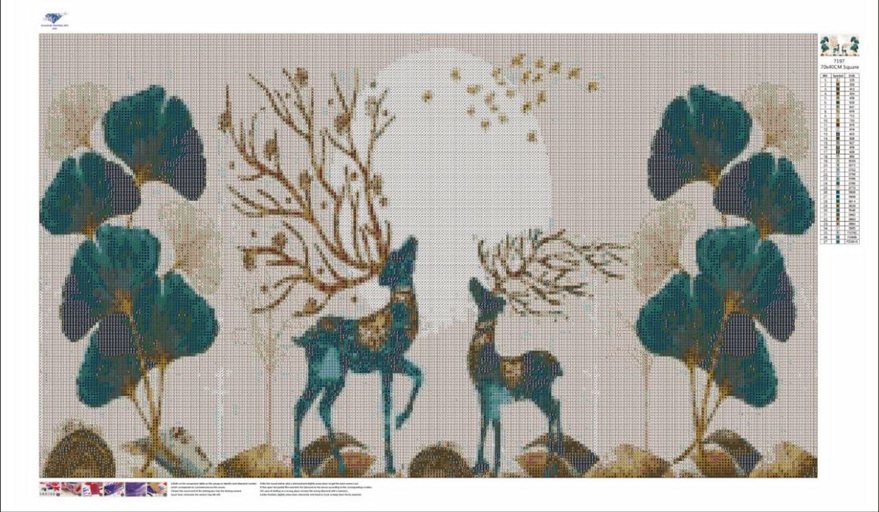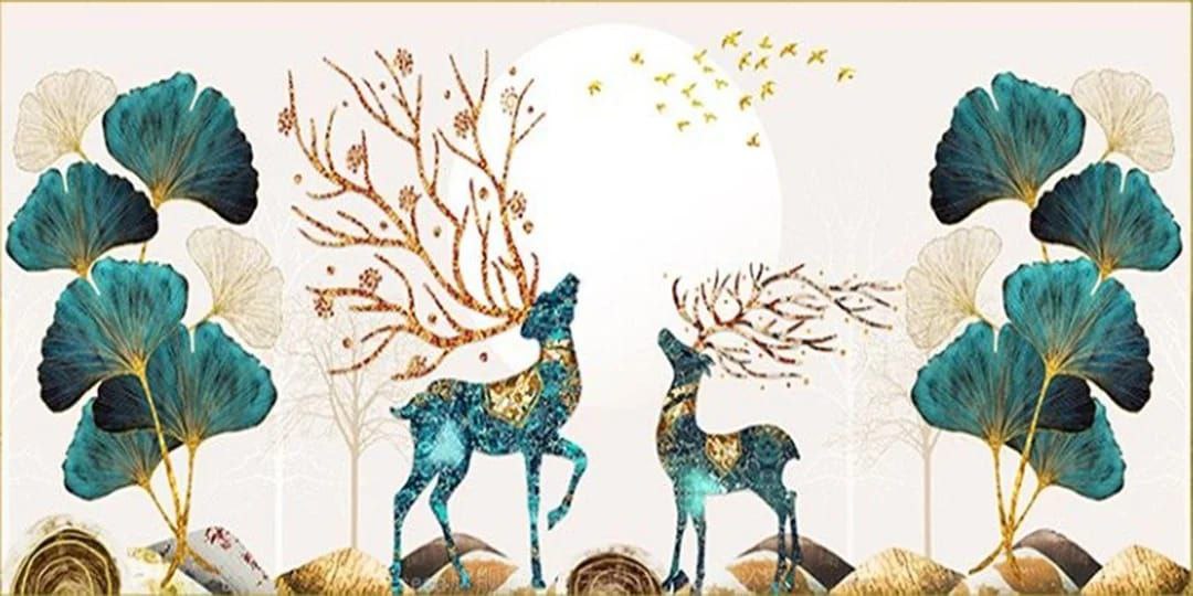 در دل جنگلی جادویی، دو گوزن آبی‌رنگ با شاخ‌های پیچیده و پر از شکوفه‌های طلایی، هر شب زیر نور مهتاب گرد هم می‌آمدند. شاخ‌های آن‌ها نه تنها زیبا بودند بلکه هر شاخه‌اش نمادی از زندگی و رشد در دل طبیعت بود. برگ‌های بزرگ و درخشان اطرافشان، همچون نگهبانانی بودند که از جنگل محافظت می‌کردند.