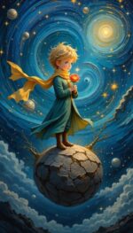 این گل، نشانه‌ی امید و زندگی بود؛ نشانه‌ای که حتی در تاریک‌ترین سیارات و سخت‌ترین شرایط، نور و زیبایی می‌توانند وجود داشته باشند. پسرک با شال زرد پروازکننده‌اش، مثل یک نگهبان کوچک، مراقب آن گل بود تا همیشه امید را در دل کهکشان زنده نگه دارد.