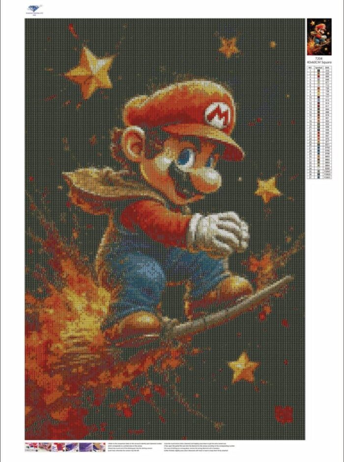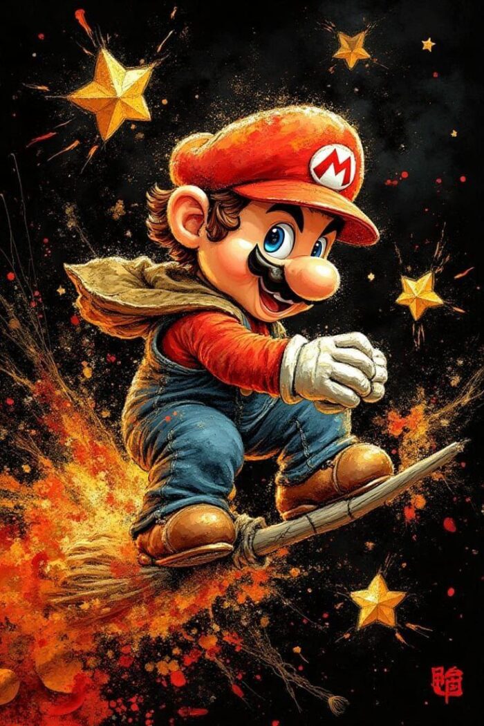 در دل شبی تاریک و پر از ستاره، ماریو با کلاه قرمز و دستکش‌های سفیدش روی جاروی جادویی‌اش سوار شد. ستاره‌های درخشان دورش می‌رقصیدند و هرکدام نیرویی پنهان داشتند. او در تلاش بود تا ستاره‌ی طلایی افسانه‌ای را پیدا کند که می‌گفتند می‌تواند قلمروی قارچ‌ها را از تاریکی نجات دهد. هر بار که یکی از ستاره‌ها به او نزدیک می‌شد، ماریو سرعت می‌گرفت و ردپایی از جرقه‌های نارنجی پشت سرش می‌گذاشت. در این شب جادویی، او باید ثابت می‌کرد که قهرمان واقعی نه از قدرت، بلکه از شجاعت و امید ساخته می‌شود.