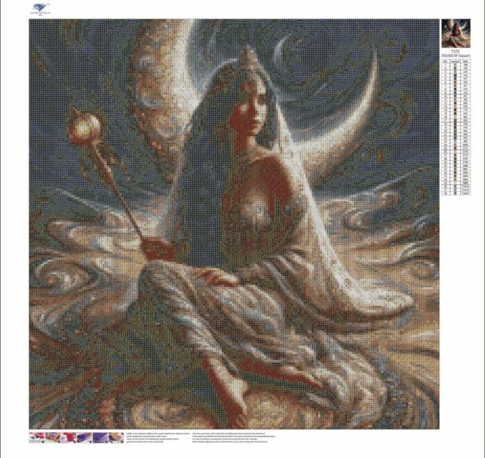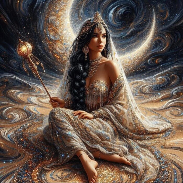 در دل آسمانی که مرز میان رؤیا و واقعیت را در هم میریزد، زنی به نام لوناسترا بر تختی از ستارگان نشسته بود. ردای طلاییاش با نقشهایی از کهکشانها و ابرهای نقرهای، همچون نقشهای از جهانهای پنهان بر تنش میدرخشید. تاجی از نور بر سر داشت و عصایی طلایی با گوی درخشان در دست، که قدرت اتصال زمین و آسمان را در خود نهفته داشت.